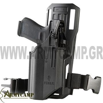 Θήκη Duty Level II LE2MEX για Glock 19, 19X, 17, 45 και παρόμοια, με ή χωρίς φακό ( Εμφανίζεται με την πλατφόρμα μηρού low ride MEX2 που συμπεριλαμβάνεται ). Για όλα τα ανωτέρω μοντέλα πιστόλιων διαφόρων γεννεών χωρίς όμως προέκταση στην λαβή .