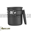 Large camp cup made of hard-anodized aluminum. May be heated on gas cookers or over fire. Has a lid, folding handle, wide enough to fit 1-liter Nalgene bottle.