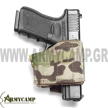 The rear of the holster has 3 rows of MOLLE webbing with 2 MOLLE arms which allows it to be attached to a diverse range of Warrior Assault Systems gear such as the PLB belt Frag Belts Cobra belts and Rigger Belts. The UPH’s MOLLE also allows it to be attached to carriers and chest rigs such as the 901.Made from high quality fabric