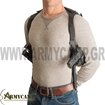 Wear the harness and adjust it to your body size by using the Velcro straps. Make sure the Polymer triangles are placed under your armpits, with one elastic strap behind your shoulders and another behind the middle of your back. Wrap the lower straps around your belt. Place your holster and pouch in horizontal positions for cross draw. Draw fast and decisive, in a horizontal line.