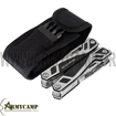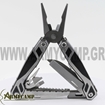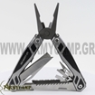 Contains spring loaded flat nose pliers, regular pliers, cutting pliers, wirecutter, wire stripper, saw, bottle opener, middle slottedscrewdriver, chisel, can opener, mini slotted screwdriver,serrated knife, sharp knife, wood or metal file, ruler,screwdriver adapter with 4 double sided screwdriver bits.