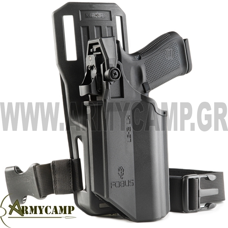 Θήκη Duty Level II για Glock 19, 19X, 17, 45 και παρόμοια, με ή χωρίς φακό ( Εμφανίζεται με την πλατφόρμα μηρού low ride MEX2 που συμπεριλαμβάνεται ) .Για όλα τα ανωτέρω μοντέλα πιστόλιων διαφόρων γεννεών χωρίς όμως προέκταση στην λαβή .