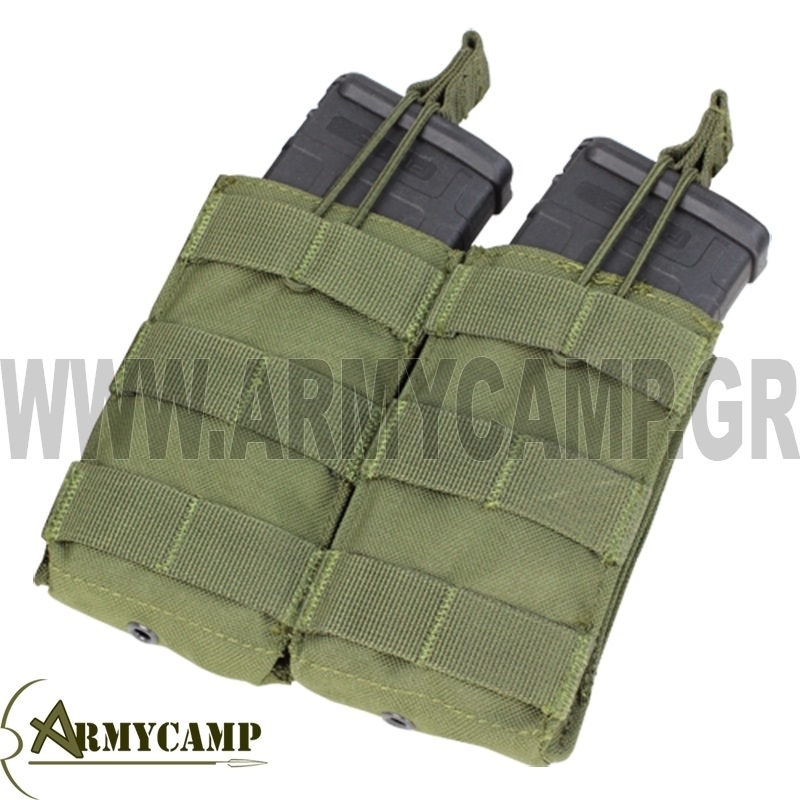 Διπλή θήκη γεμιστήρων πιστολιού 9mm και 0.45 με λάστιχο στο πλάϊ και καπάκι προστασίας. Γίνεται και ανοιχτή μιας και το καπάκι αφαιρείται εύκολα .Ιδανική για το πεδίο και το σκοπευτήριο .Ιδανική θήκη και για σουγιά - πολυεργαλείο