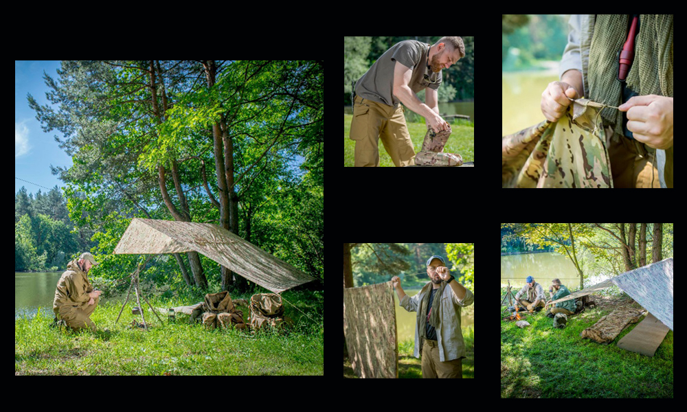 We have created a universal shelter cape for bivouac-goers. 19 attachment points provides for about an endless choice of possible configurations for all terrains and climes. To keep it lightweight, we made it out of plastic-coated ripstop fabric. Reinforced attachment points and glued seams guarantee durability and sealing. The zippered cover allows allows easy packing, even when wet. Eight ribbons allow to cinch the cover to the backpack, saving the internal capacity. The drawstring-compressed bad enclosed with the tarp allows to compact it for transport.